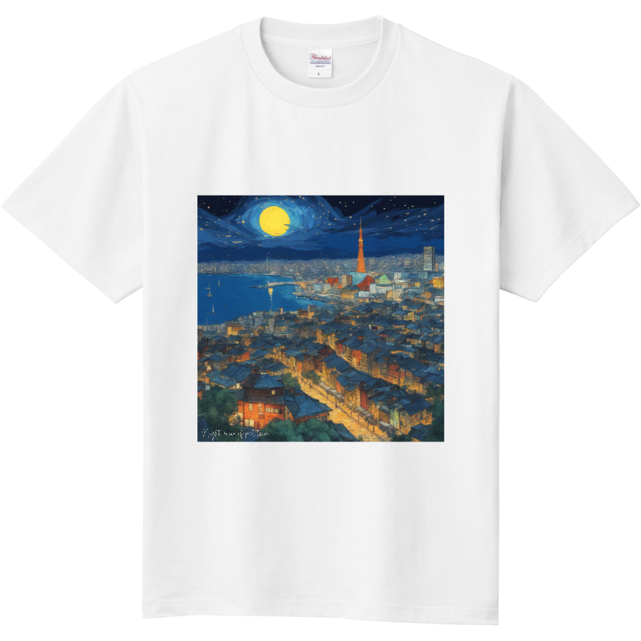 港町の夜景が美しいイラストデザインのTシャツです。着心地の良い素材と快適なシルエットが、デイリーユースに最適です。