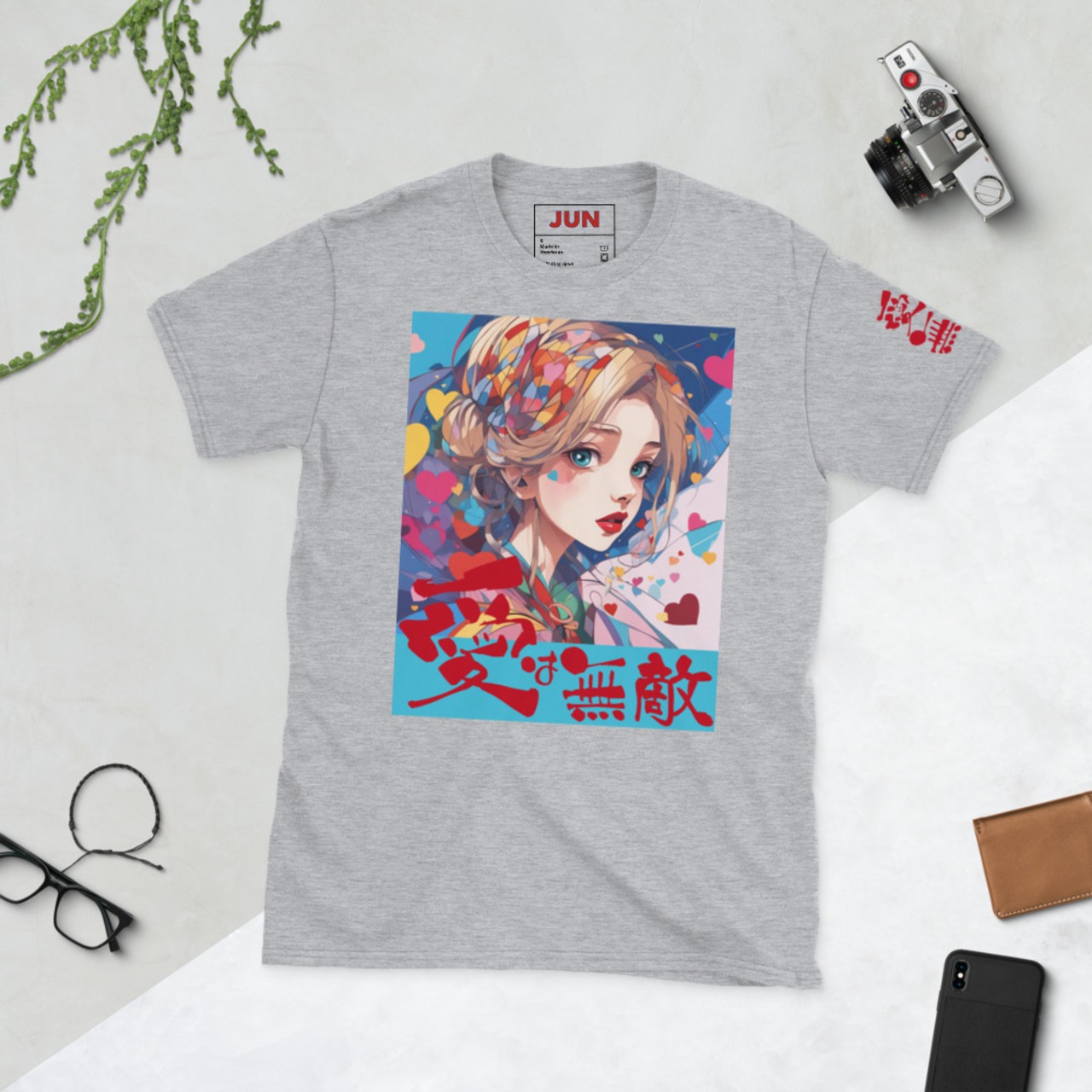 「愛は無敵2」のユニセックスTシャツは、愛の力を象徴する素敵なデザインの半袖Tシャツです。華やかな女性のイラストが描かれており、周りと差をつけたい人にぴったりのアイテムです。