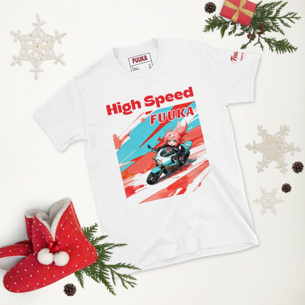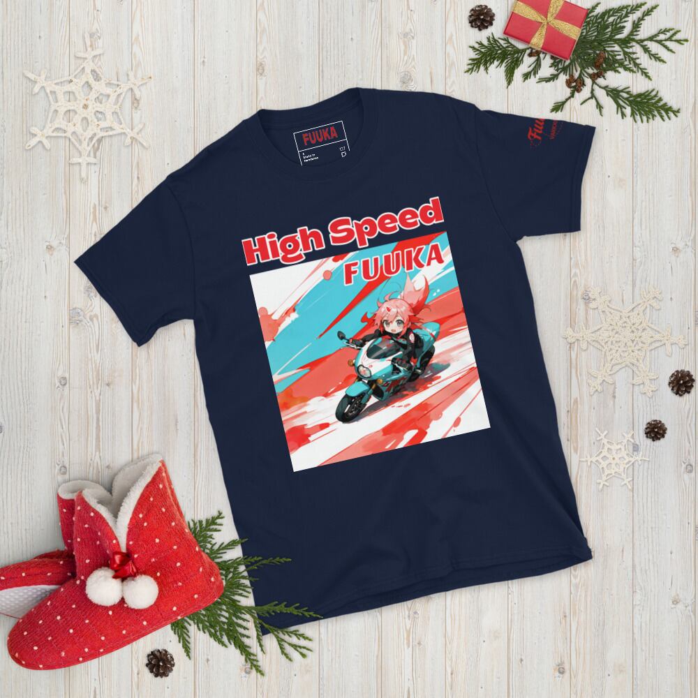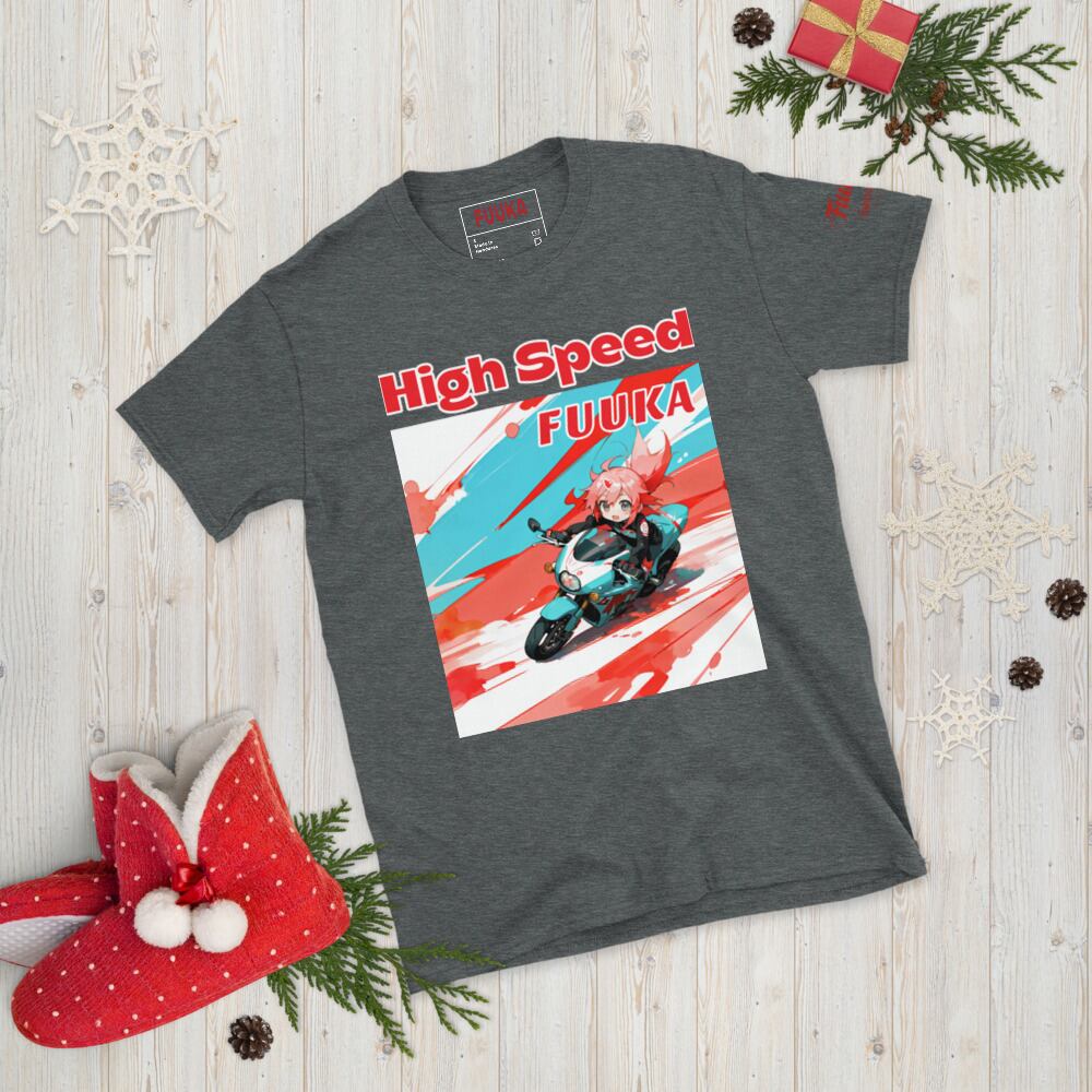 ハイスピードふうか 半袖ユニセックスTシャツは、バイクでフルスピードで駆け抜ける元気なふうかちゃんのイラストデザインが特徴です。男女問わず着ることができるユニセックスなデザインなので、カップルやご家族でお揃いで着ることもできます。