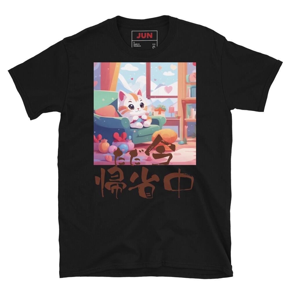 ただ今帰省中の猫が居間でくつろいでいるかわいいイラストデザインの半袖ユニセックスTシャツです。柔らかな肌触りの素材を使用しているので、着心地も抜群。エアコンの効いた場所でも快適に過ごせます。