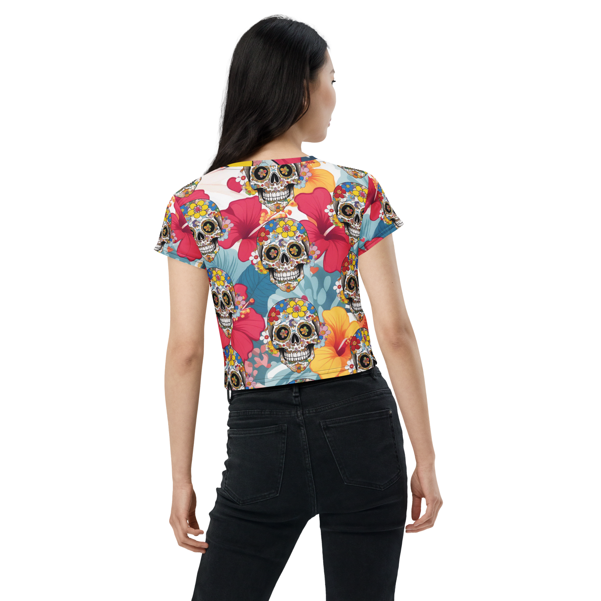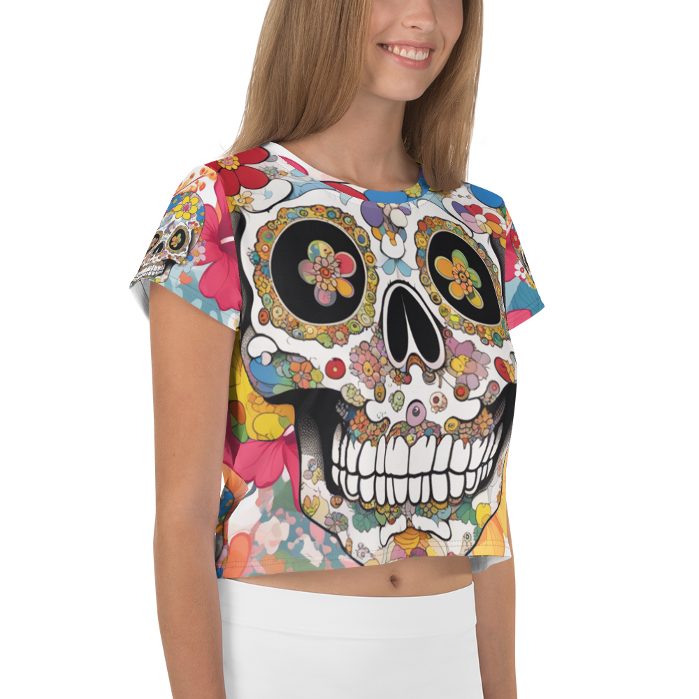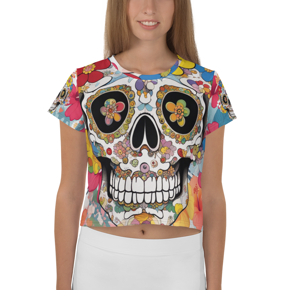 カラフルな花たちが背景に広がる、オシャレなシャレコウベのイラストデザインが特徴のクロップTシャツです。花の美しさとシャレコウベの個性的な存在感が相まって、目を引く一枚に仕上げました。