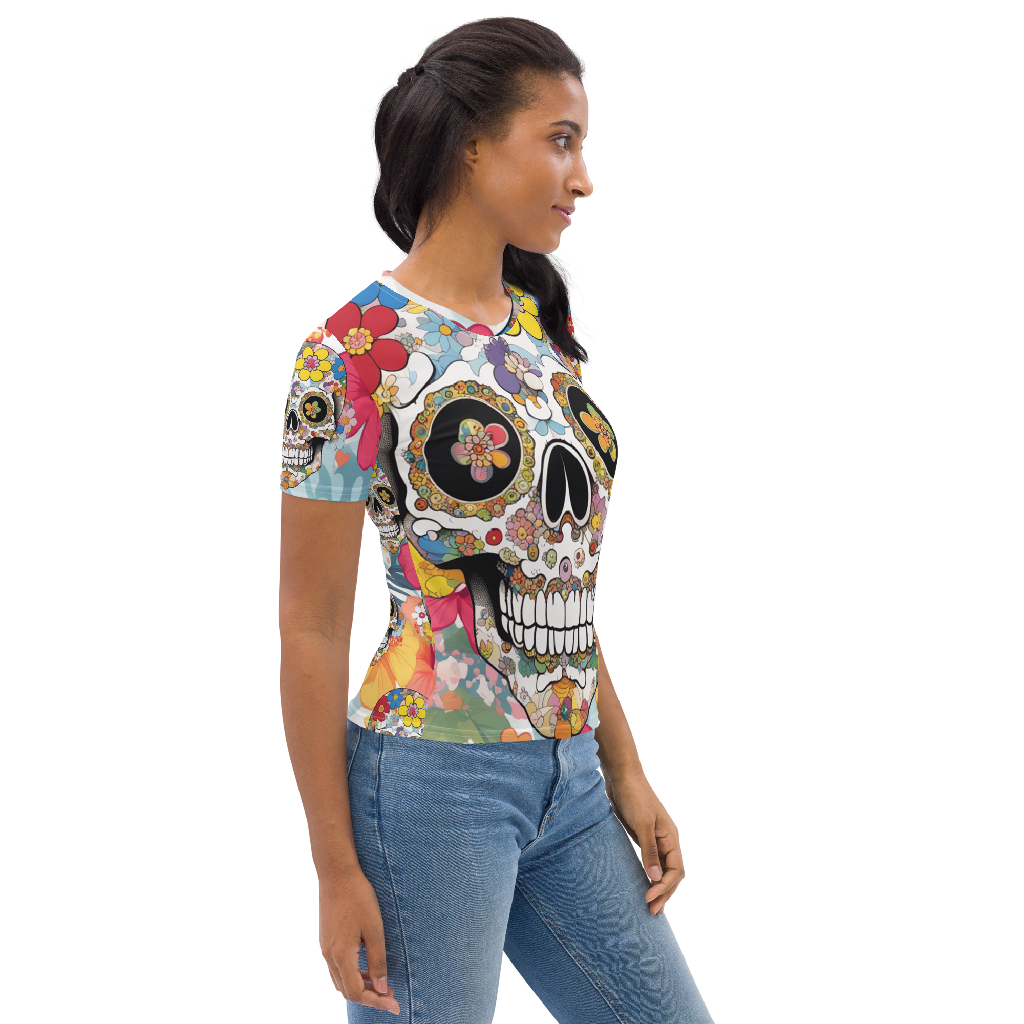 華やかで個性的なデザインが魅力の花とシャレコウベ 02 レディースTシャツ。オシャレなイラストが施されたこの一枚は、あなたのコーディネートにアクセントを加え、周りから注目されること間違いなしです。