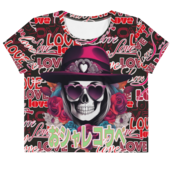 おしゃれなイラストと可愛いロゴが特徴の「おシャレコウベ 01 クロップTシャツ」。背景には"LOVE"の文字が散りばめられており、可愛くおしゃれなデザインです。クロップトップのデザインなので、トレンディなスタイルを楽しむことができます。