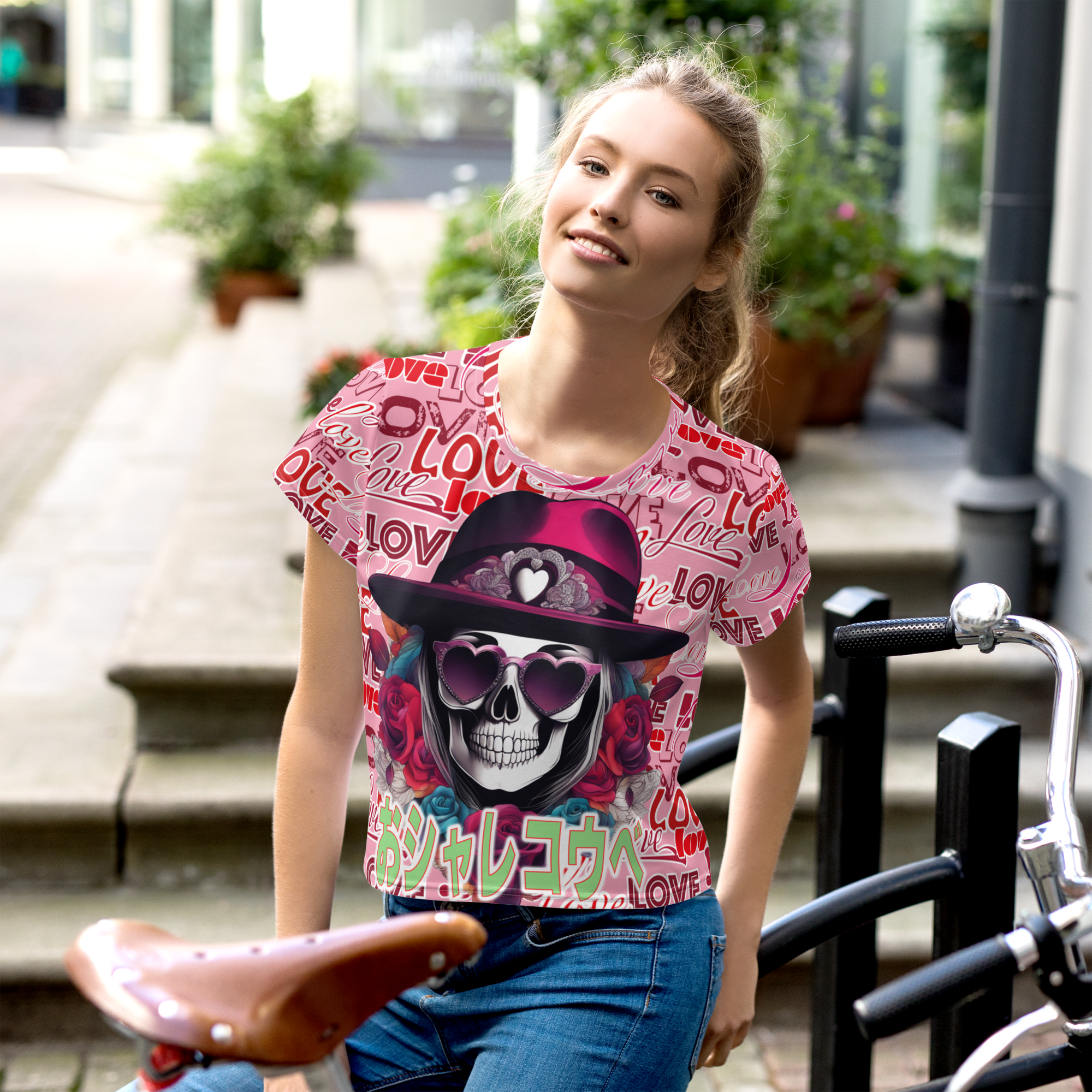 胸元にはお洒落なシャレコウベのイラストとおシャレコウベのロゴ文字が入り、背景にはLoveの文字がちりばめられています。トレンド感溢れるデザインで、おしゃれを楽しむアイテムとしておすすめです。