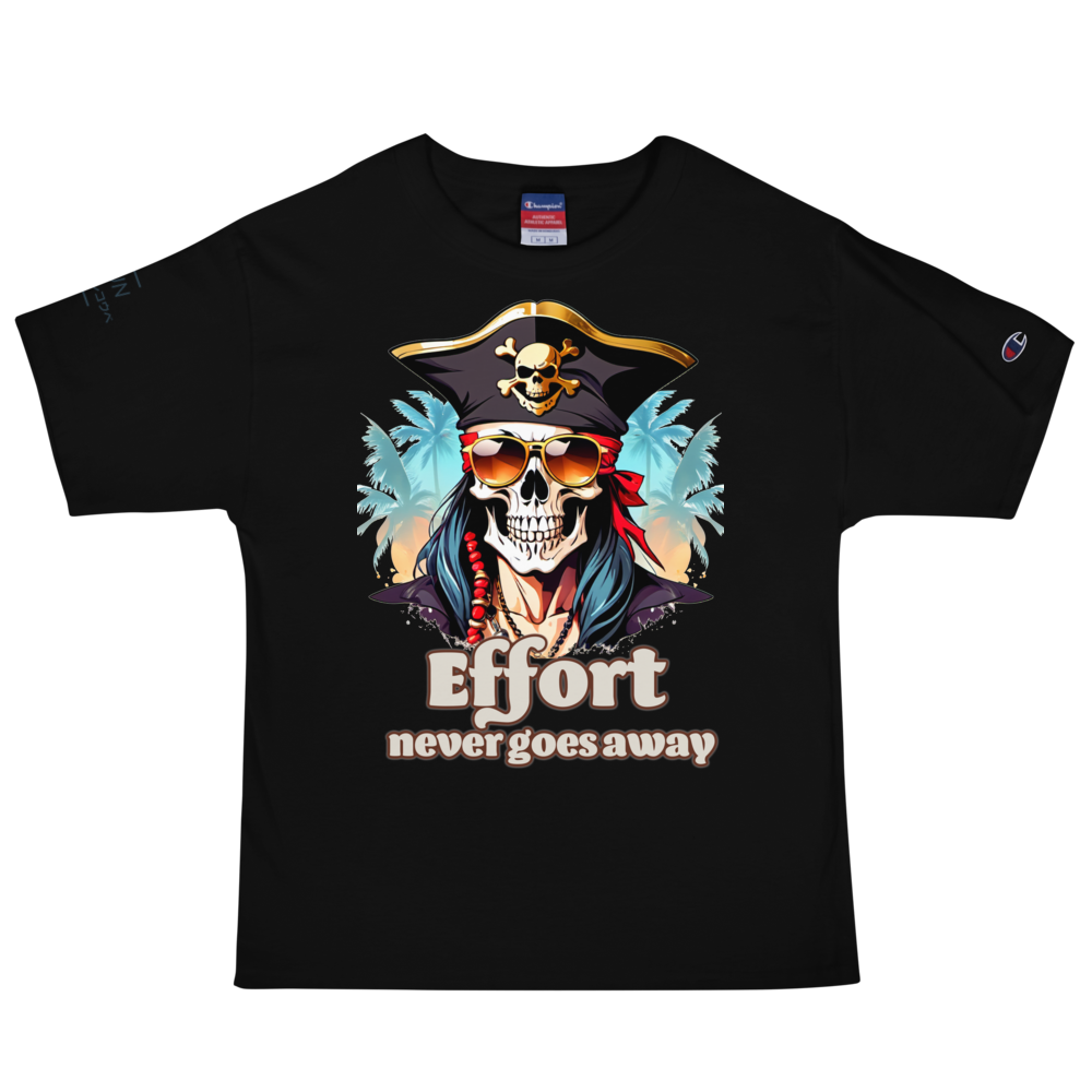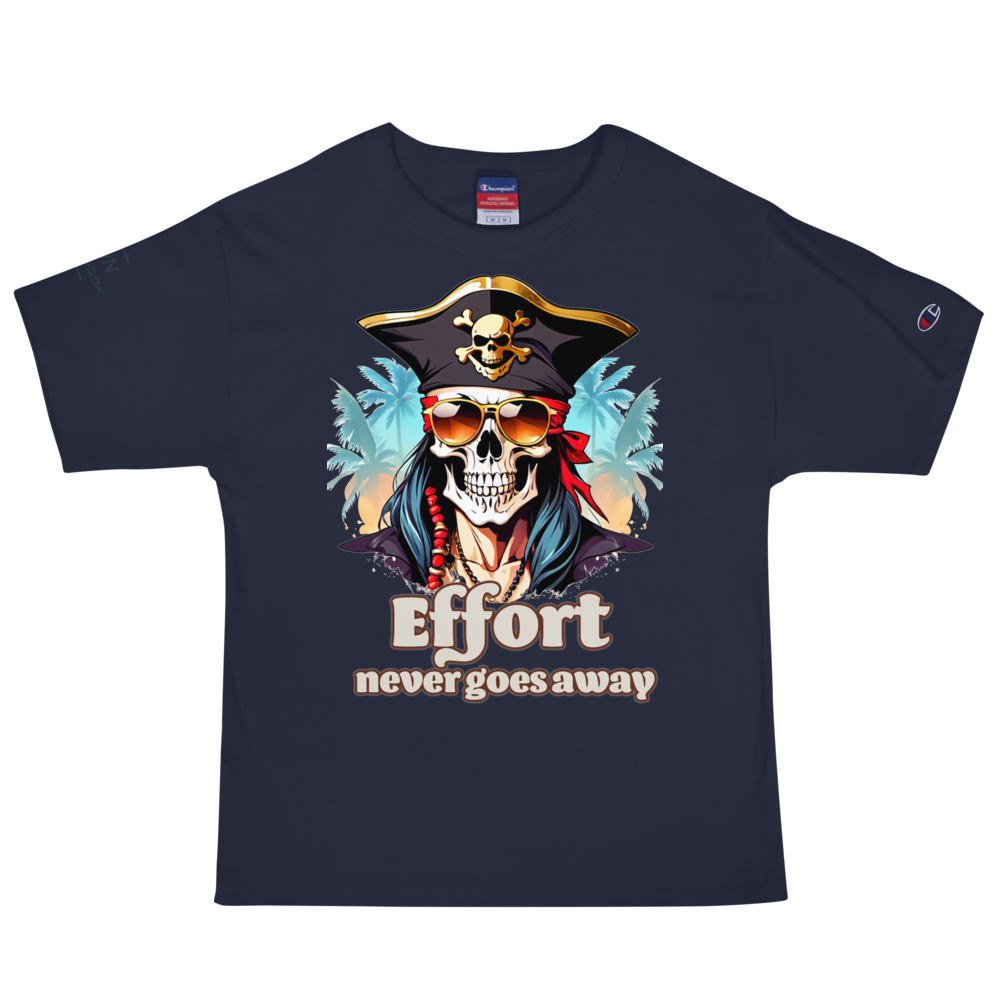 おしゃれなイラストとメッセージが描かれた『おシャレコウベ Effort never goes away 02 メンズ Champion Tシャツ』。シャレコウベのキュートなデザインと、メッセージの込められたロゴが、あなたのスタイリングに個性をプラスしてくれます。日常の中で忘れがちな「努力は消えない」というメッセージを胸に刻み込み、自分自身を高める一枚になることでしょう。