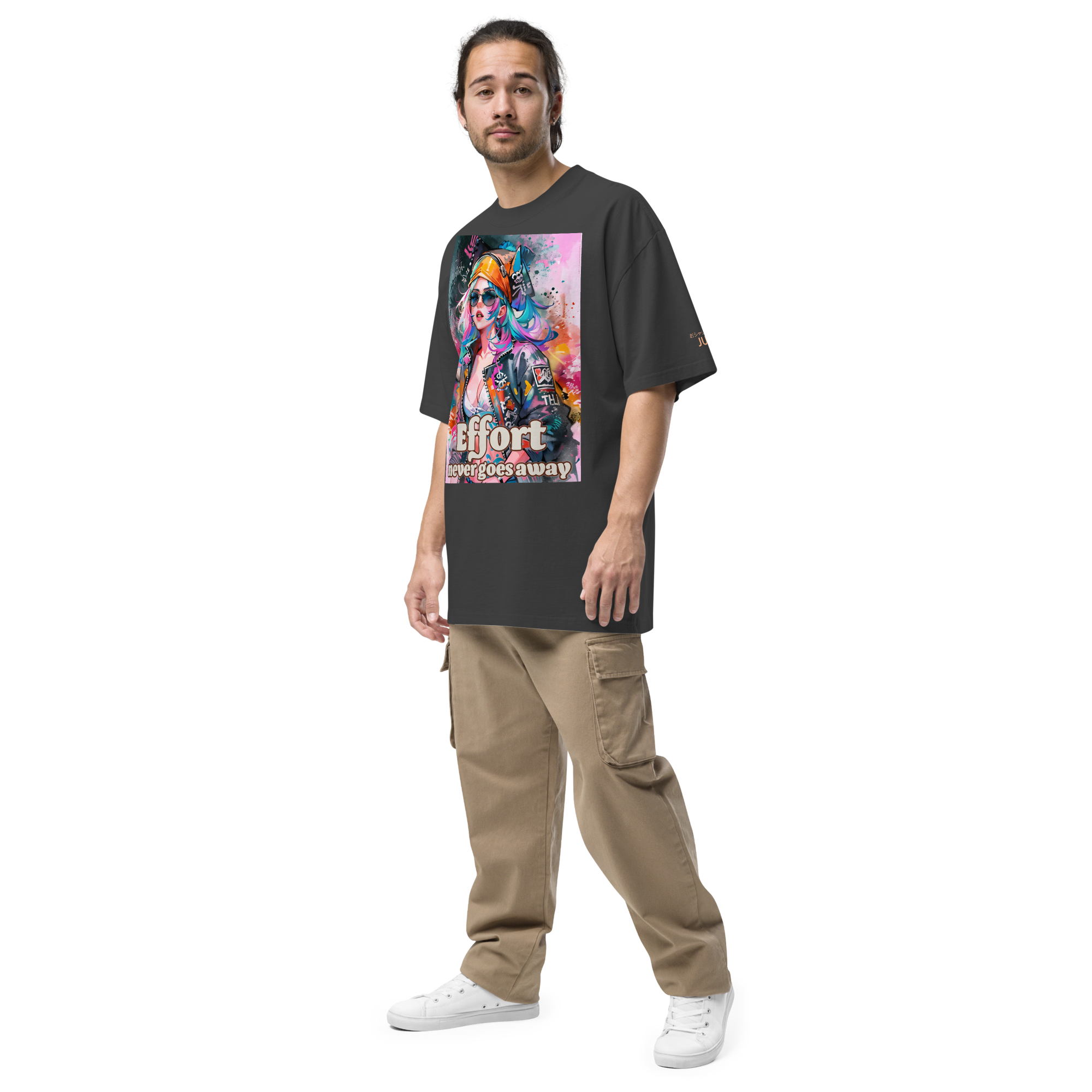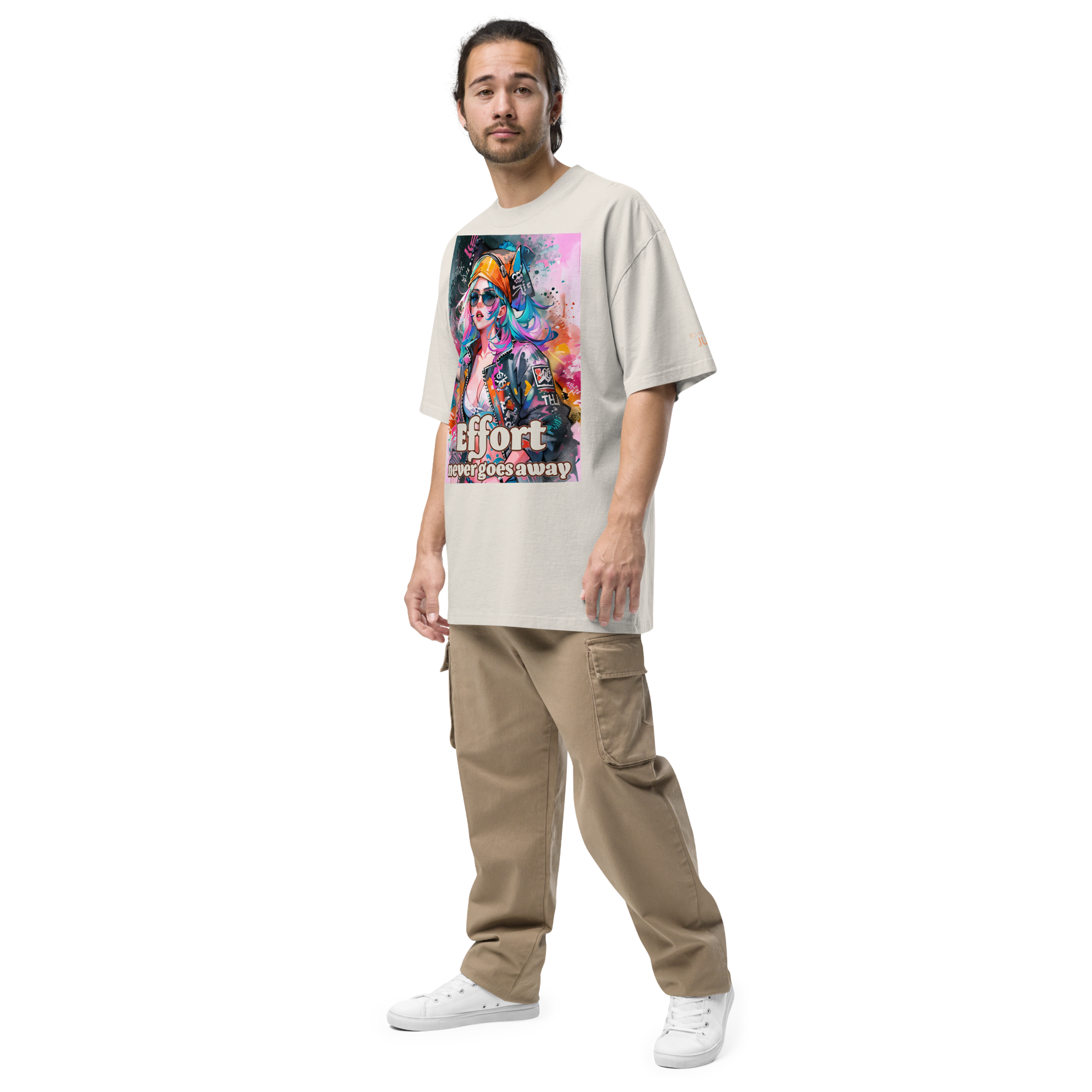 Effort never goes away 01A オーバーサイズフェードTシャツは、カッコいい女性のイラストと"Effort never goes away"のロゴデザインが特徴的な一枚です。シンプルながらも力強いメッセージを持つこのTシャツは、どんなスタイルにもマッチしてくれます。