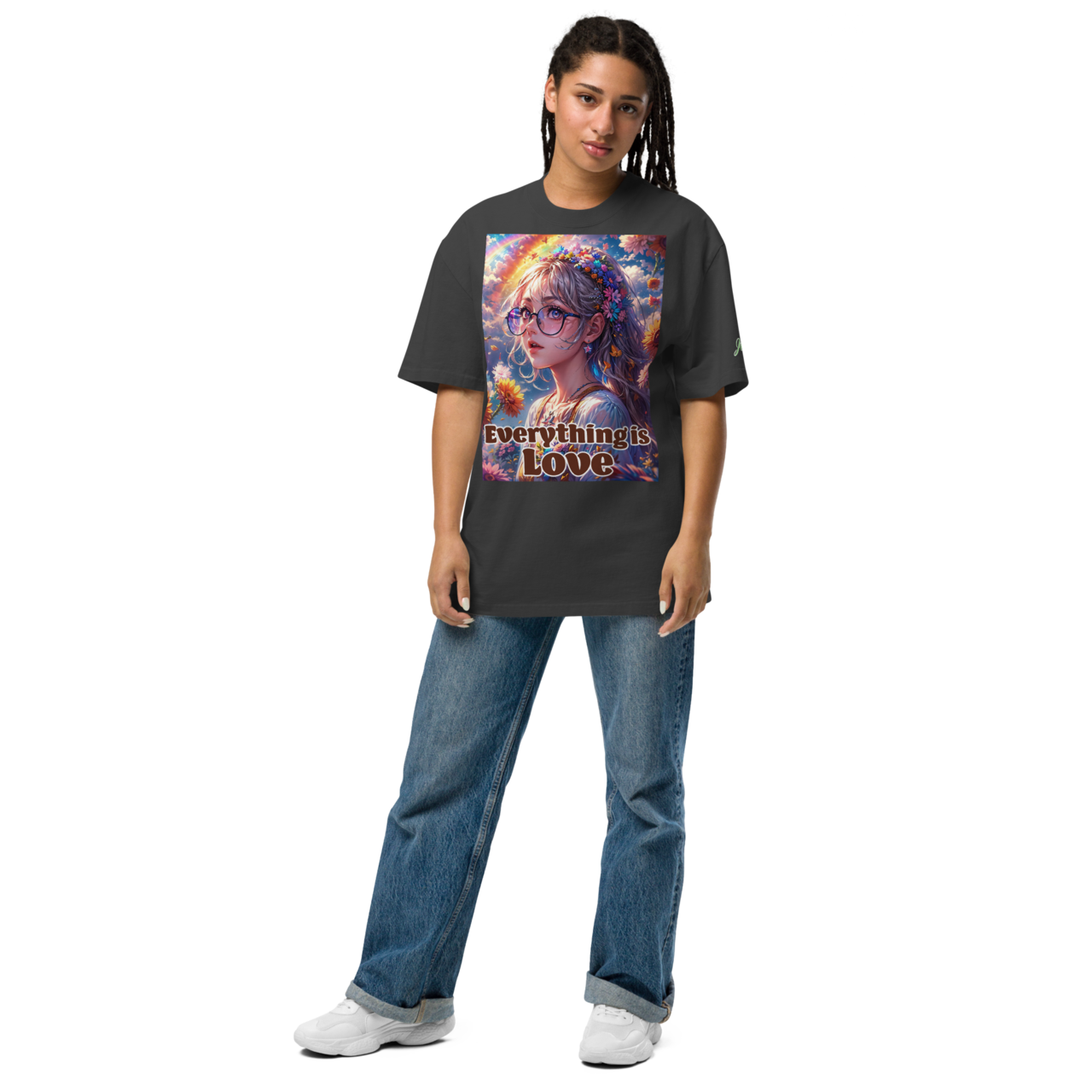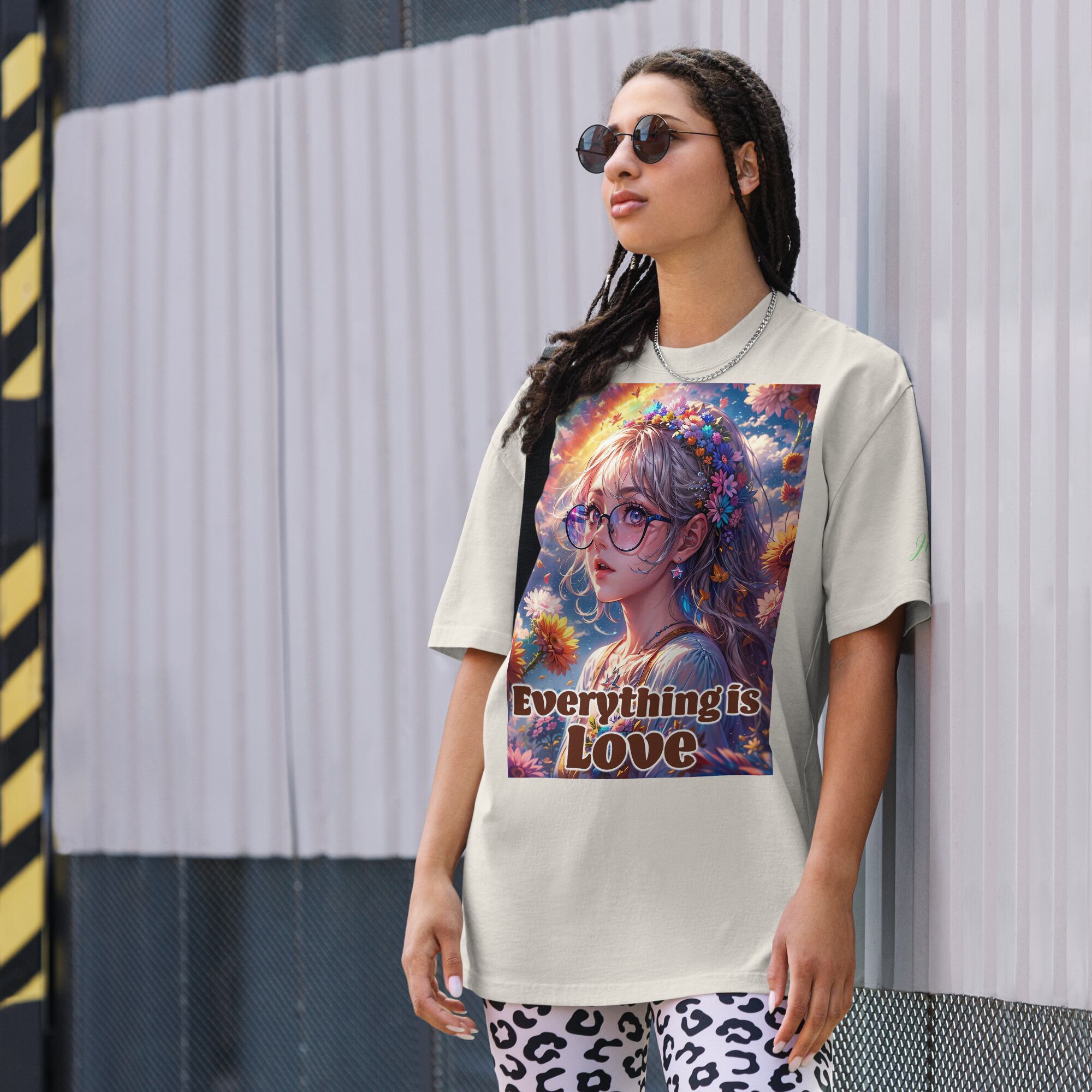 女性の美しいイラストが施された、Everything is Love 01 A オーバーサイズフェードTシャツ。このTシャツは、すべては愛というメッセージを込めたロゴデザインが特徴です。
