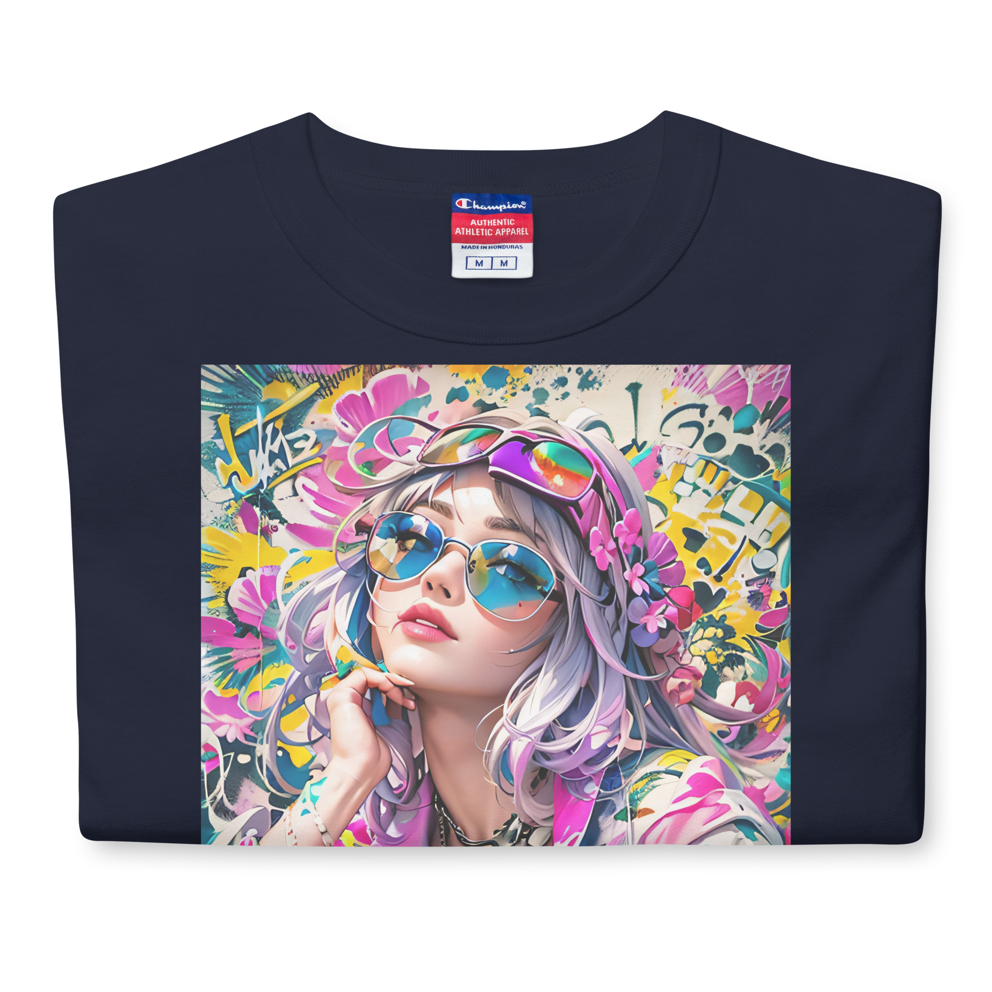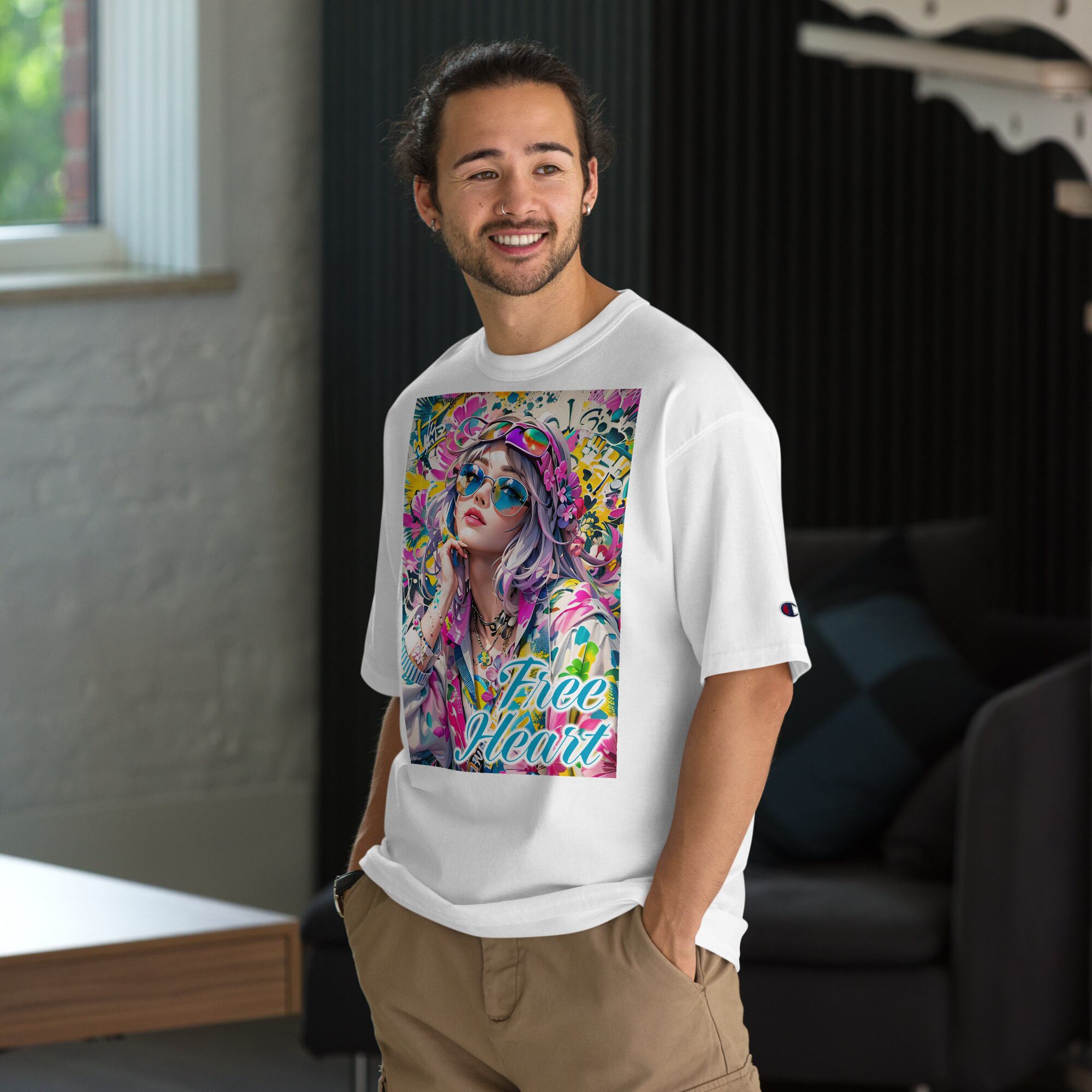 Free Heart 01 メンズ Champion Tシャツは、ストリート系少女のお洒落なイラストとFree Heart(自由な心)のロゴ文字がデザインされた一枚。カジュアルな中にも、個性的でエッジが効いたデザインがお洒落ポイントです。どんなスタイルにも合わせやすく、自由な心を感じさせるデザインは、周りと差をつけたい方におすすめです。