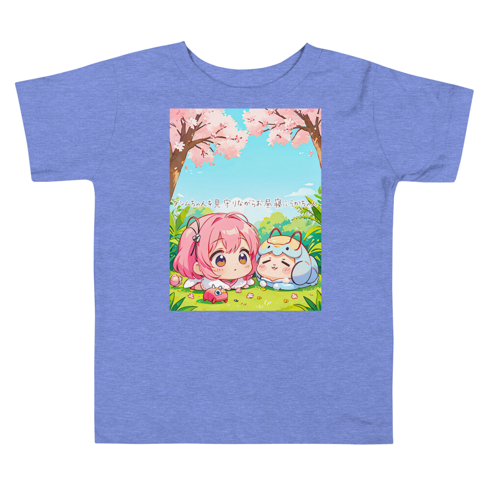 ダンムちゃんとふうかちゃんが描かれたベビー半袖Tシャツ。可愛らしいイラストと優しい色合いが赤ちゃんのお昼寝タイムを彩ります。柔らかな素材で、赤ちゃんのお肌にも優しい着心地です。