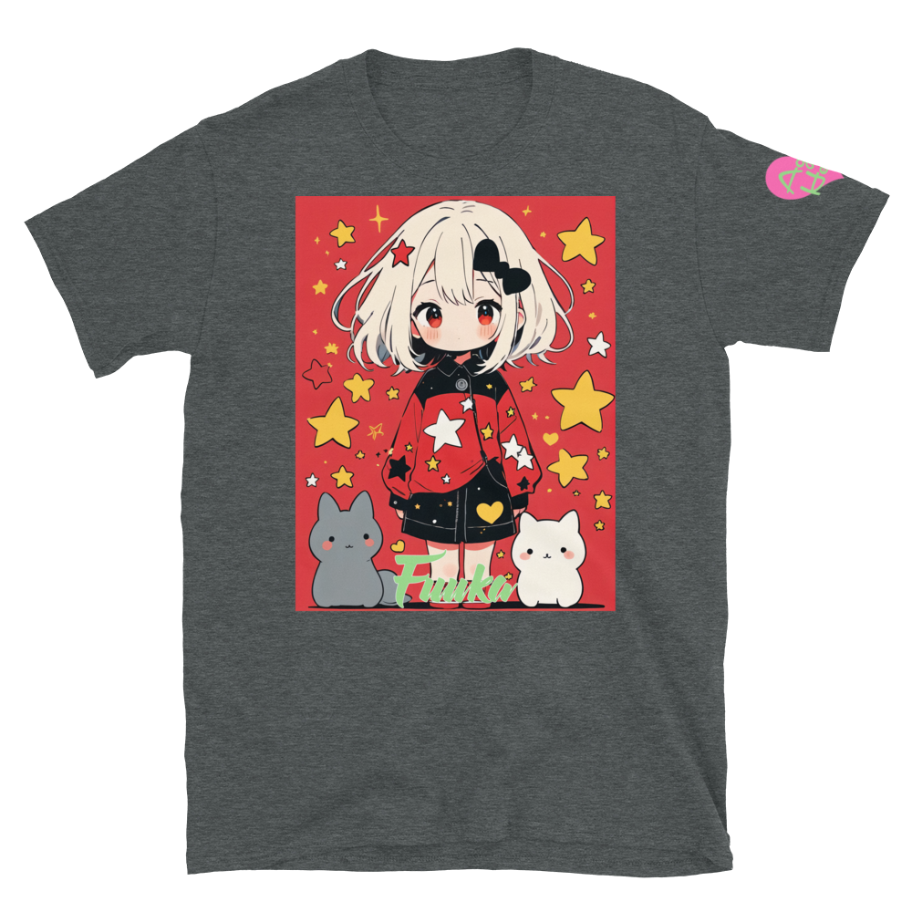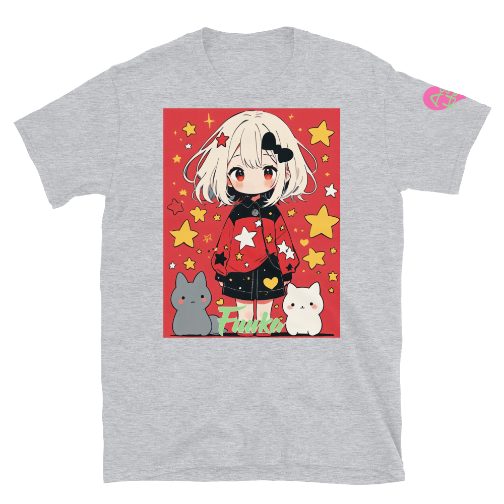 カラフルで可愛いふうかちゃんのイラストが入った半袖ユニセックスTシャツ、Fuuka 01。心の時代をコンセプトにしたロゴマークもポイントです。シンプルなデザインながらも、ふうかちゃんの魅力が詰まった一枚は、どんなスタイルにも合わせやすく、誰もが気軽に楽しめるアイテムです。