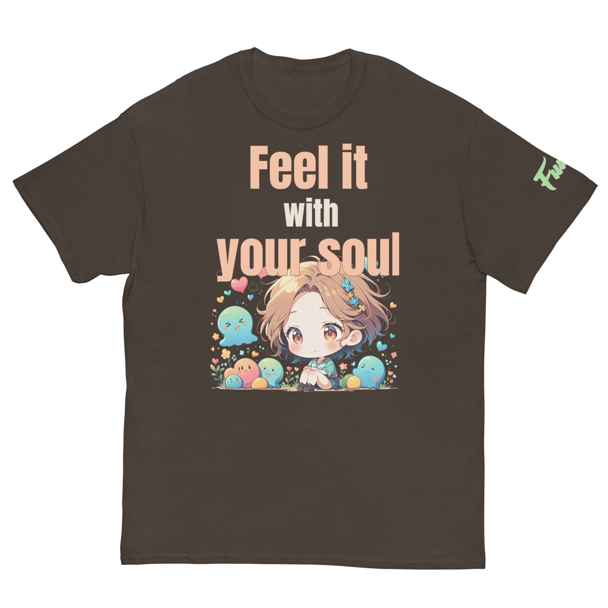 ユニセックスで人気のクラシックTシャツ、魂で感じろ 01。でこちゃんのかわいいイラストにFeel it with your soul(魂で感じろ)のロゴフレーズが入っています。カジュアルなスタイルに上質なデザインをプラスし、一枚でオシャレ度がアップします。