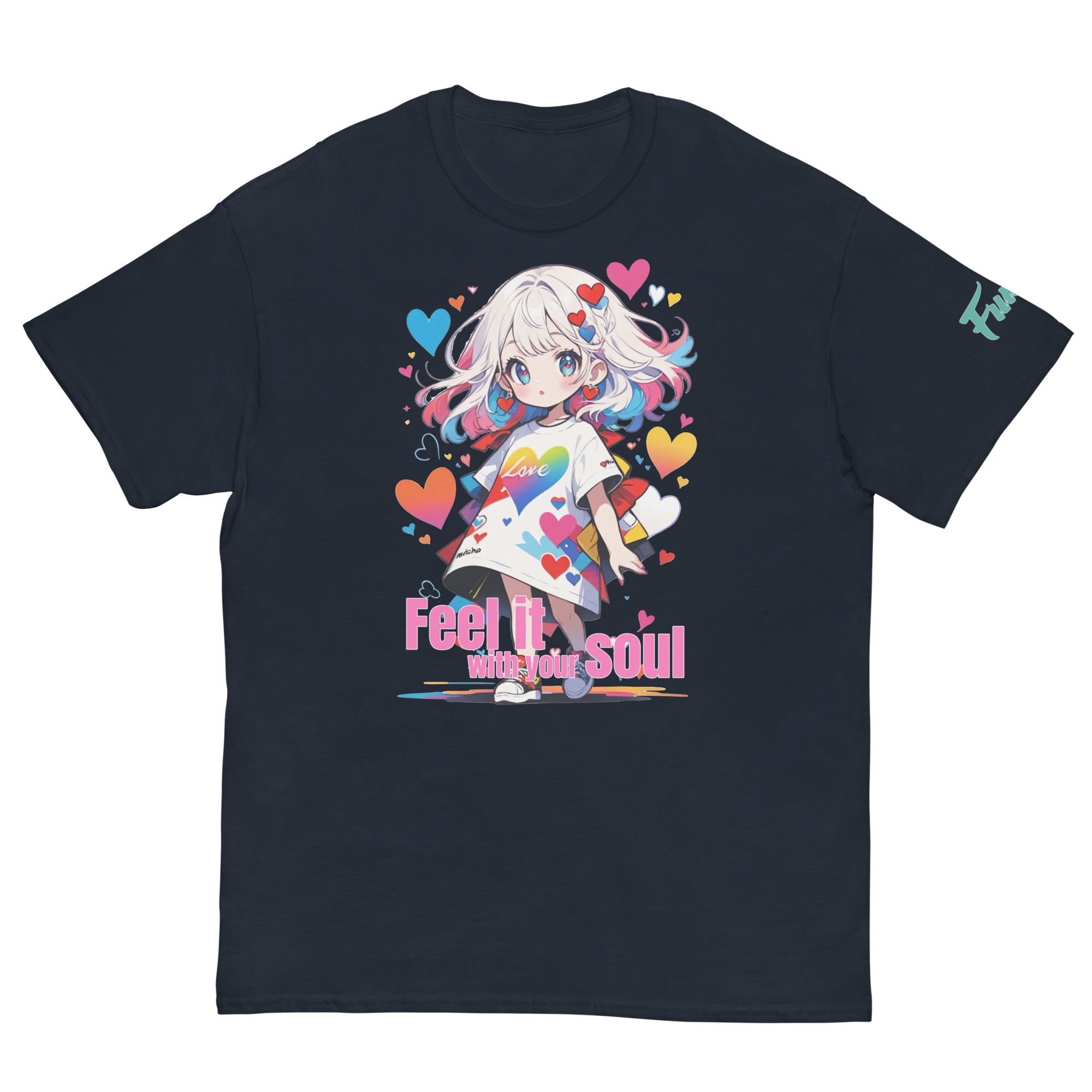 魂で感じろ 01A ユニセックスクラシックTシャツは、特別な一枚をお探しの方にぴったりのアイテムです。でこちゃんの可愛いイラストと"Feel it with your soul"のロゴフレーズが入ったデザインは、誰もが心を掴まれること間違いなし!男女を問わずお使いいただけるユニセックス仕様で、幅広いシーンで活躍してくれます。コットン素材で肌触りも抜群で、着心地も快適です。