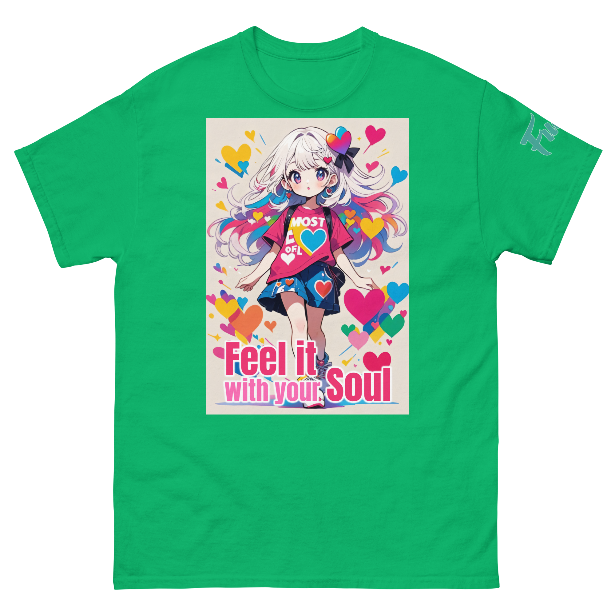 Feel it with your Soul(魂で感じろ)をテーマにした04BユニセックスクラシックTシャツ。鮮やかな色合いとポップなイラストが目を引く、お洒落でかわいらしいデザインです。男女を問わず、幅広い年代の方にお楽しみいただける一枚です。